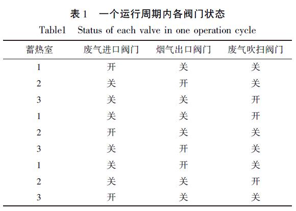 程因?yàn)槭峭ㄟ^(guò)程序控制氣動(dòng)調(diào)節(jié)閥工作, 能在短時(shí)間內(nèi)切換閥門狀態(tài), 保證三個(gè)蓄熱室一次完成蓄熱、放熱和吹掃的過(guò)程。在一個(gè)運(yùn)行周期內(nèi)每個(gè)蓄熱室下的閥門切換狀態(tài)如表1 所示。