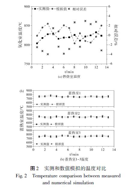 在連續(xù)監(jiān)測(cè)穩(wěn)定運(yùn)行階段多個(gè)切換周期后, 將燃燒室三個(gè)熱電偶及變送器監(jiān)測(cè)的爐膛溫度值計(jì)算得到平均值, 同時(shí)將每個(gè)蓄熱室中的出口位置熱電偶的溫度值進(jìn)行記錄, 圖2 為同一測(cè)點(diǎn)的工程實(shí)際數(shù)據(jù)與數(shù)值模擬值的對(duì)比。通過(guò)對(duì)比, 得到溫度模擬數(shù)據(jù)與實(shí)際監(jiān)測(cè)值的相對(duì)誤差均在4% 以內(nèi), 這也可能