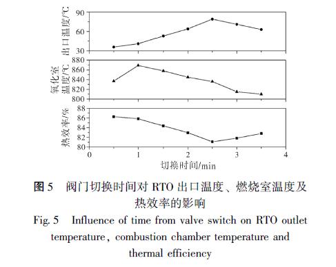 分, 不利于提高熱效率和廢氣處理效率。同時(shí), 熱效率也隨著切換時(shí)間的增加而減少, 不利于VOCs 的高效處理和余熱利用。切換時(shí)間的逐漸增加在2 ~ 2. 5 min 時(shí), 蓄熱室吸收的熱量增加, 導(dǎo)致蓄熱室與煙氣的溫差減小, 排氣出口溫度升高, 且燃燒室溫度和熱效率仍有降低。隨著切換時(shí)間的進(jìn)一步增加到2. 5 分鐘以上, 進(jìn)氣過(guò)程的蓄熱室溫度進(jìn)一步下降, 導(dǎo)致進(jìn)氣蓄熱體和燃燒室中的氣體溫度繼續(xù)下降, 在排氣過(guò)程中供給蓄熱體吸收的熱量減少, 排氣出口溫度開(kāi)始下降, 有利于熱效率的提高。